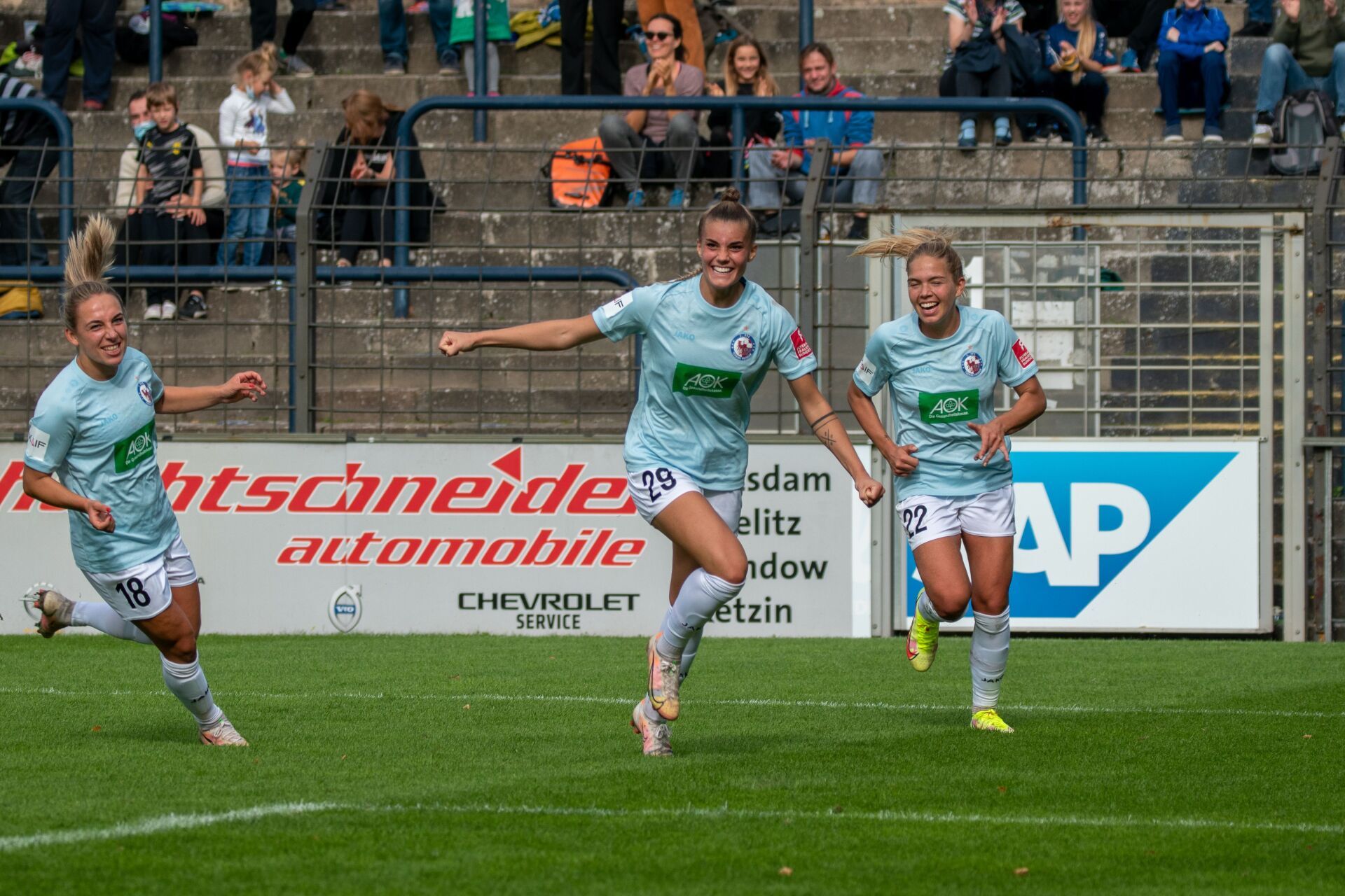Selina Cerci (Mitte) jublelt über ihren Treffer. Sie schoss mit ihren beiden Treffer Potsdam zurück in die Partie gegen Essen.